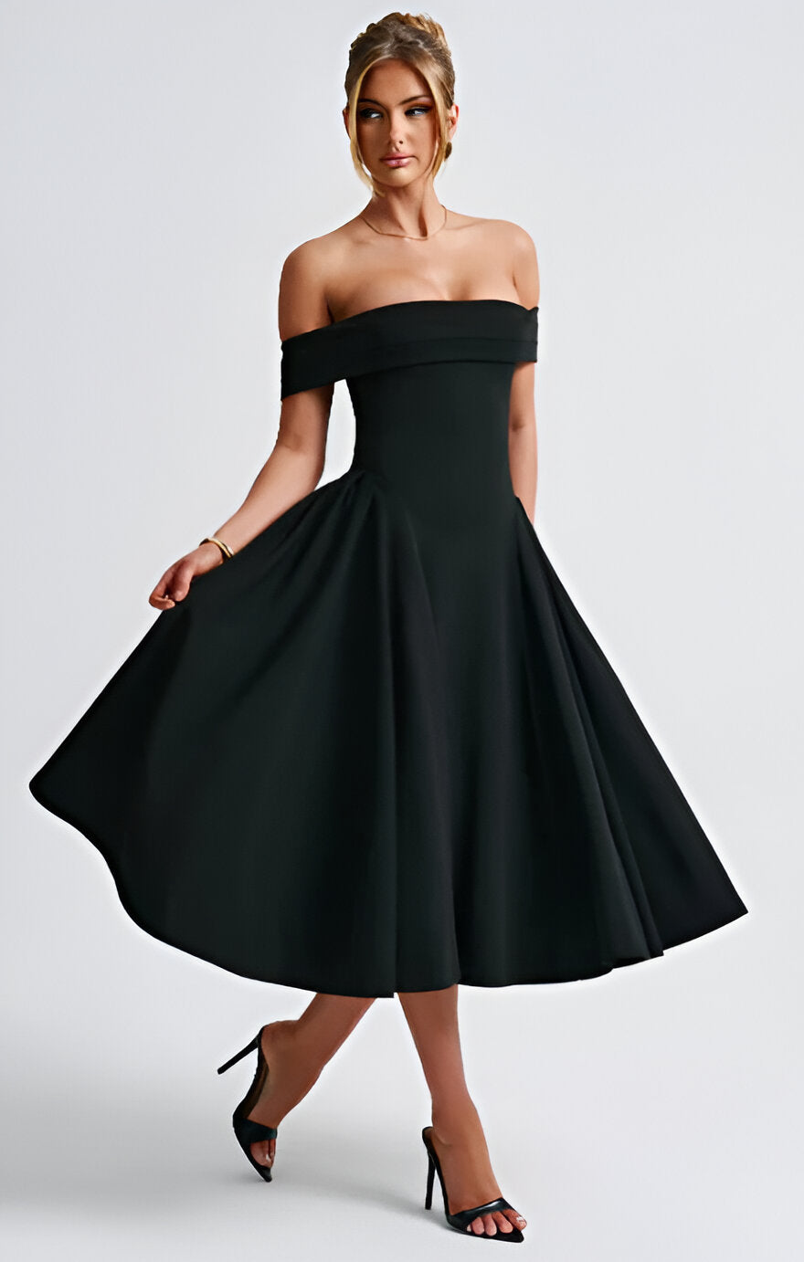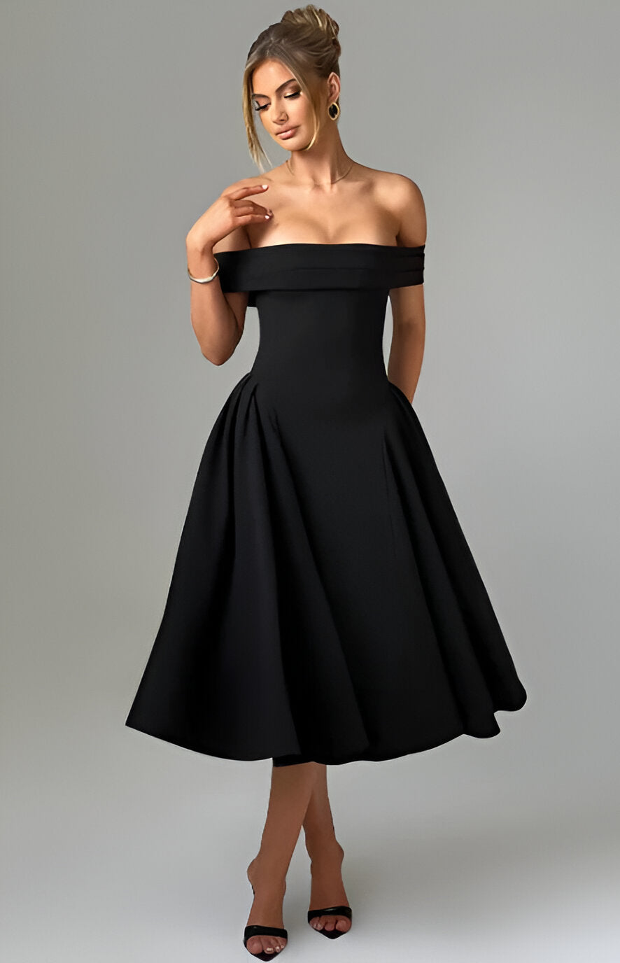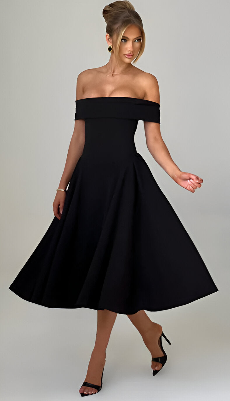 Stell dir vor, du bist bei einem romantischen Abendessen, bei einer gehobenen Veranstaltung oder sogar an einem Date-Abend und strahlst Selbstbewusstsein und Charme aus. Gefertigt aus luxuriösem Stretch-Crepe-Stoff, schmiegt sich dieses Kleid perfekt an deine Kurven und bietet sowohl Komfort als auch Stil. Der Bardot-Ausschnitt und der mit Tüll unterlegte Rock schaffen einen Look, der ebenso anmutig wie unvergesslich ist.