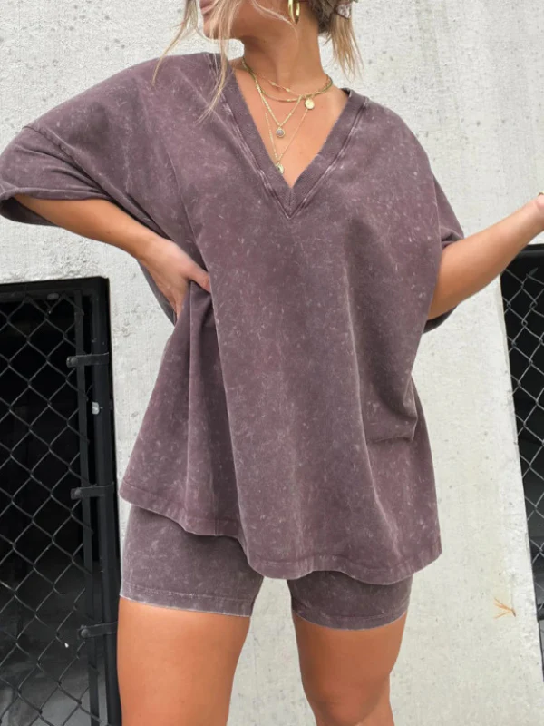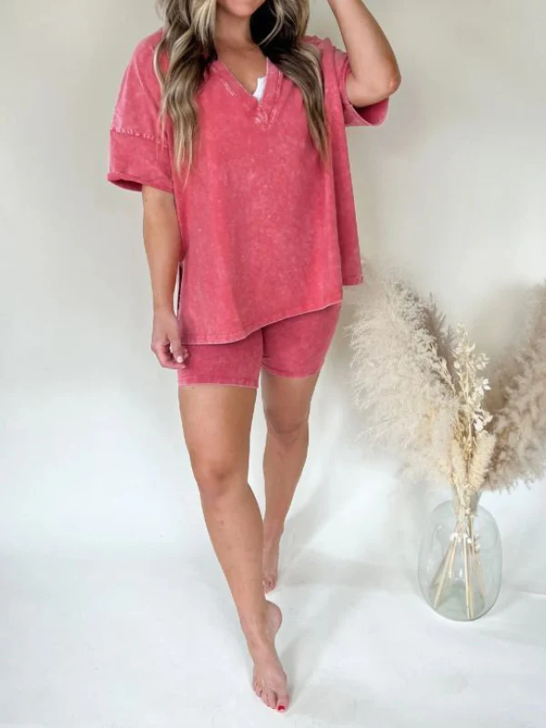 Dieses trendige, gewaschene Sommerset ist so konzipiert, dass es sich nahtlos in Ihren geschäftigen Lebensstil einfügt. Mit seiner schicken und entspannten Ausstrahlung ist es perfekt für alles, von einem legeren Brunch bis zu einem Abend mit Freunden. Die Uni-Farbe und das gewaschene Design verleihen einen Hauch von Raffinesse, während die lockere Passform des T-Shirts und die eng anliegende Passform der Shorts dafür sorgen, dass Sie immer für den Erfolg gekleidet sind.
