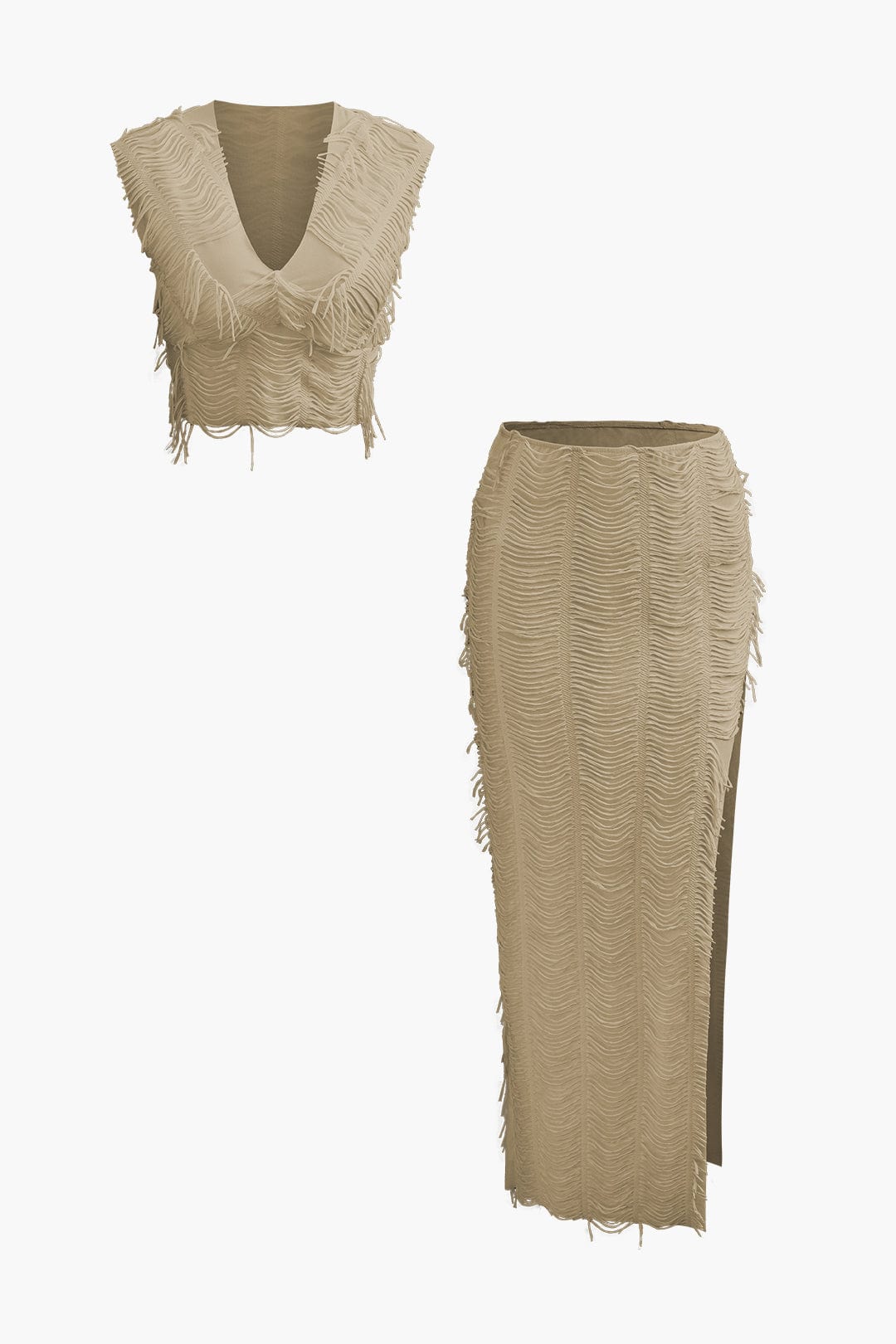 Der Charlene Fransen-Zweiteiler ist ein atemberaubendes Ensemble, das Stil und Dynamik vereint. Das ärmellose Top mit V-Ausschnitt sorgt für eine feminine Note, während der figurbetonte Rock mit seitlichem Schlitz und langen Fransen eine elegante Bewegung verleiht. Perfekt für besondere Anlässe, Partys oder sommerliche Abendveranstaltungen.