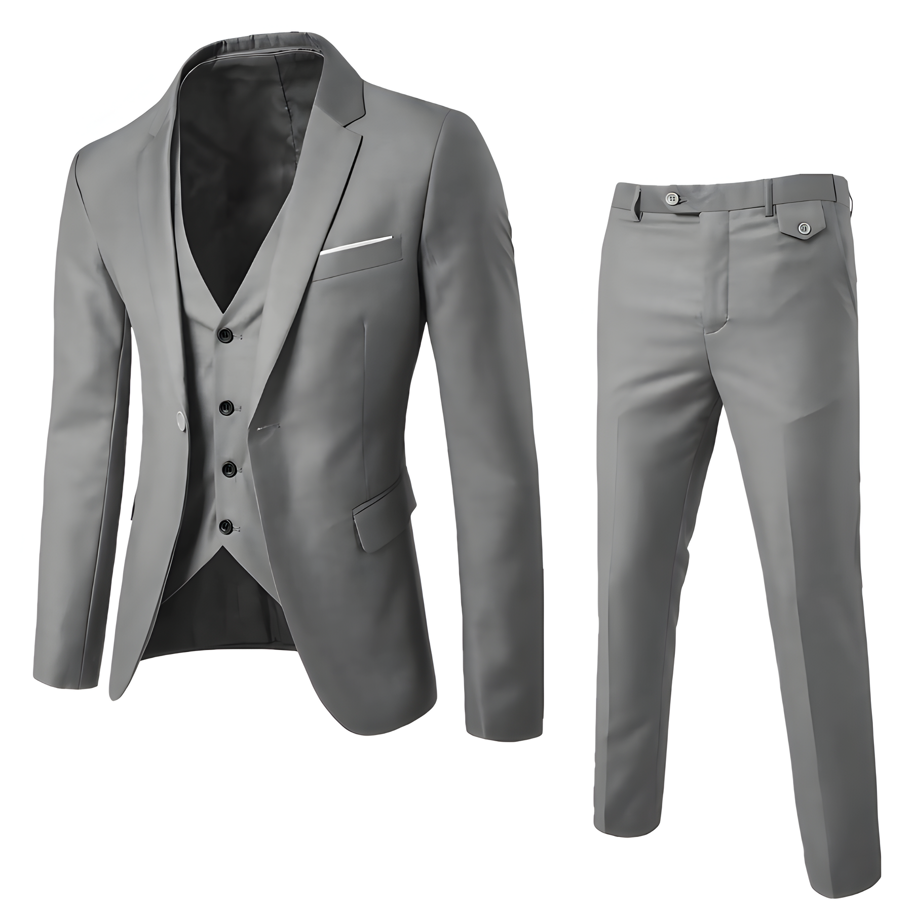 Dreiteiliges Komplettset: Sakko, Weste und Hose ergeben ein harmonisches Outfit mit klarer Linienführung.