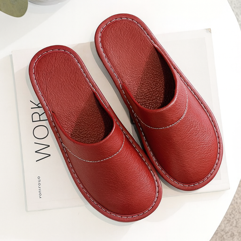 Diese Herrenhausschuhe verfügen über ein geschlossenes Slip-on-Design mit strukturierter Oberfläche und kontrastierenden Ziernähten entlang der Kanten. Die robuste Sohle sorgt für sicheren Halt im Innenbereich, während der niedrige Fersenbereich ein einfaches An- und Ausziehen ermöglicht. Ideal für den täglichen Gebrauch zu Hause.