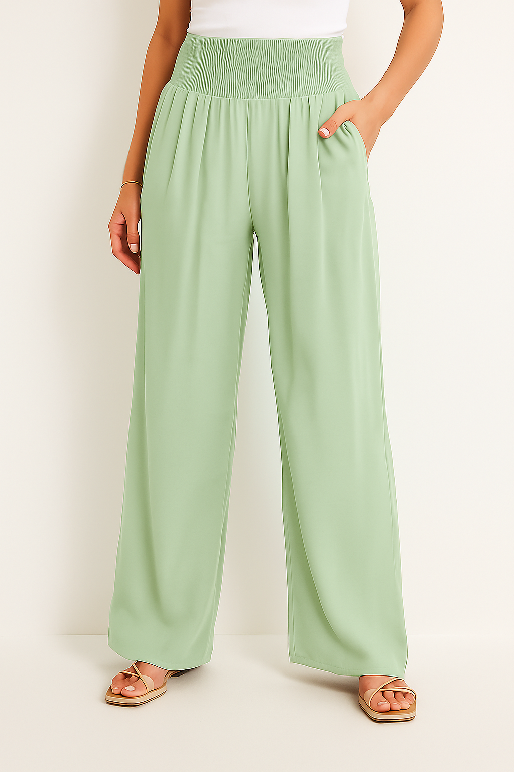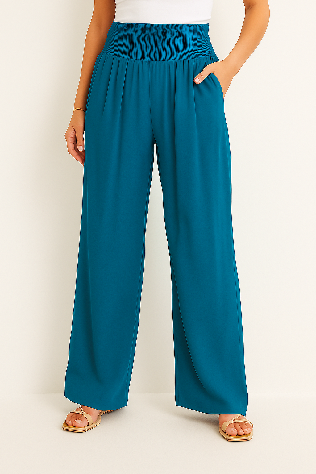 Diese luftige Hose ist wie gemacht für warme Tage, an denen Komfort und Stil gleichermaßen zählen. Der elastische High Waist Bund sorgt für eine flexible Passform, während das weite Bein eine elegante, fließende Silhouette zaubert. Ob am Strand, beim Stadtbummel oder im Urlaub, dieses Modell lässt sich mühelos kombinieren und begleitet dich durch jeden sommerlichen Anlass.